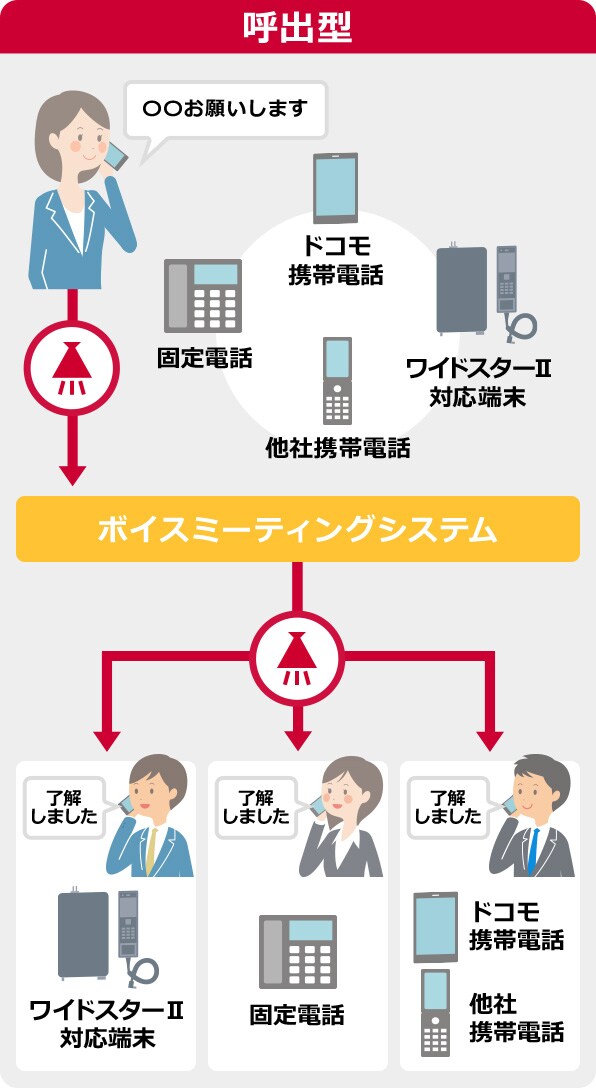 ボイスミーティング通信料は、ボイスミーティングシステムから着信した回線に対しての通信料です。ドコモの携帯電話などがボイスミーティングシステムへ発信した場合は、別途回線契約に基づく通話・通信料が必要となります。