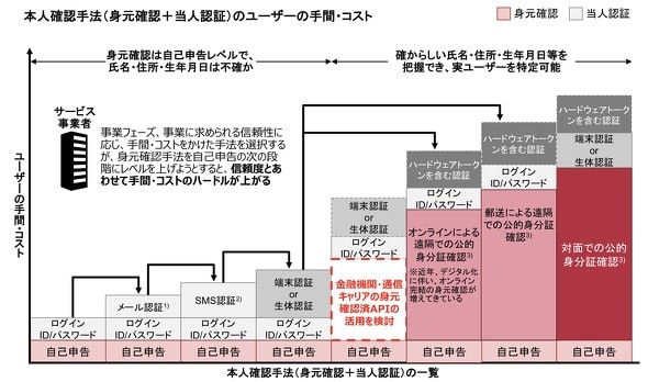 このように本人確認の精度を上げるには、さまざまな仕組みが必要だが、例えば対面での公的身分証の確認には大変な手間がかかることが容易に想像できる。2020年4月17日に経済産業省が発表した「オンラインサービスにおける身元確認手法の整理に関する検討報告書」(以下「検討報告書」)では、本人確認における課題として、確からしさをアップしようとすると、手間やコストが上がってしまうことが挙げられている。