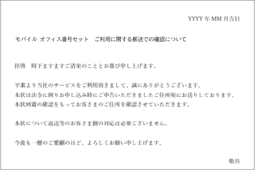 - サービスご利用中にも、電話番号のご利用場所住所に書留郵便を定期送付します。書留郵便の送付日時や時期を指定することはできません。書留郵便をお受け取りいただけなかった場合、サービスを利用停止します。一定期間の利用停止後は、サービスに係る契約を廃止します。