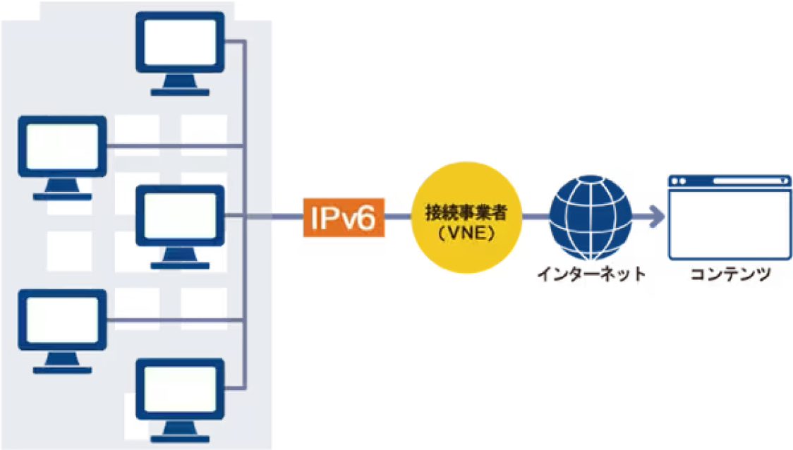 IPoEは「IP over Ethernet」の略で、企業内のLANなどと同じやり方で直接インターネットに接続する方式です。PPPoEでは、電話回線を前提とした技術をイーサネットに応用しましたが、IPoEは最初からイーサネットを用いる前提で考えられています。そのため、PPPoEのように専用の通信機器を必要とせず、接続事業者(VNE=仮想通信提供事業者)を介してシンプルにインターネットに接続できるメリットがあります。