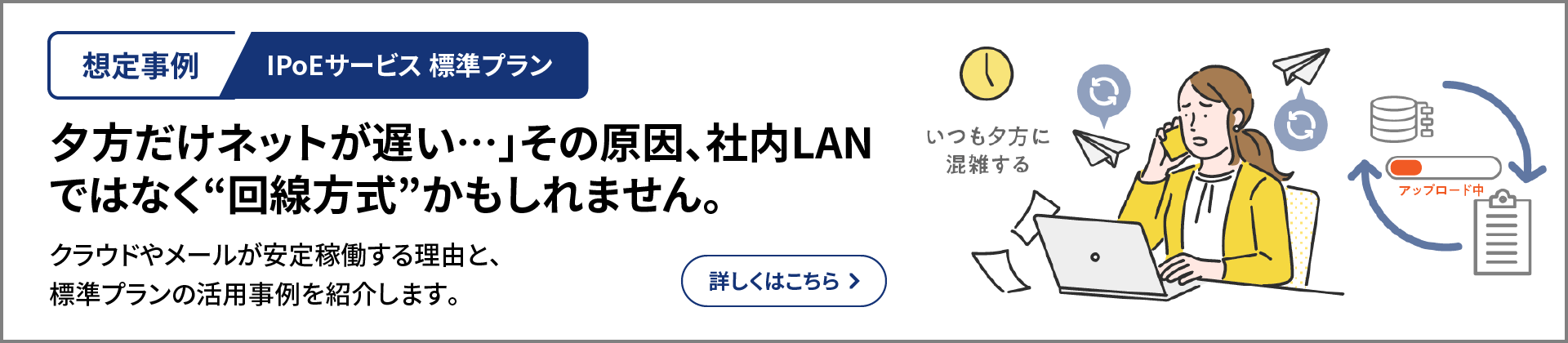 オプションサービスOCN光 IPoEサービスは「フレッツ 光クロス」回線(通信速度:最大概ね10Gbps ※1)にも対応。大容量通信やクラウド業務の利用が多い企業でも、より高速で安定したネットワーク環境を構築できます。