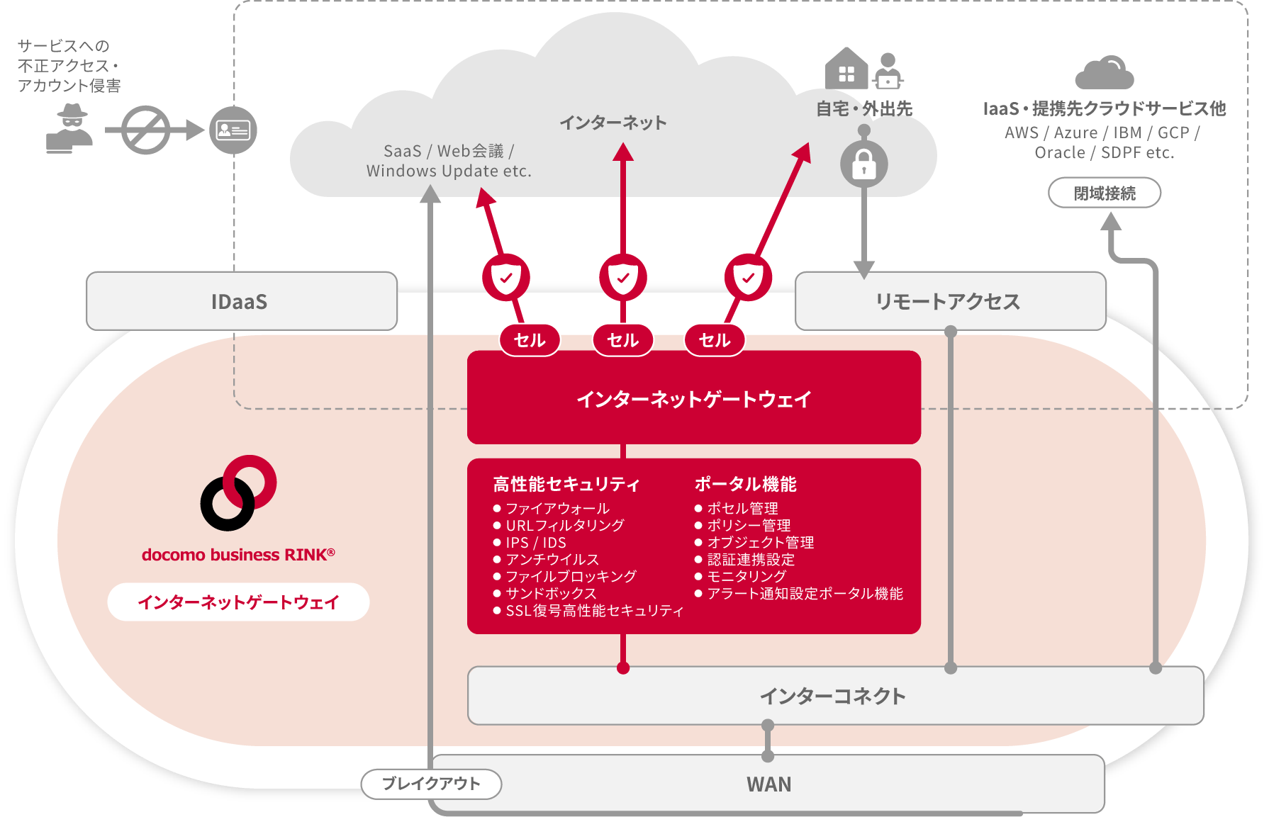 docomo business RINK®(Flexible InternetConnectやFlexible Remote Accessなど単体利用含む)やArcstar Universal One連携し、データセンター、オフィス拠点、リモート環境、各種クラウドサービスなど、あらゆる拠点からのインターネットアクセスをセキュアかつ柔軟にアクセスし、お客さまのDX推進を後押しします。