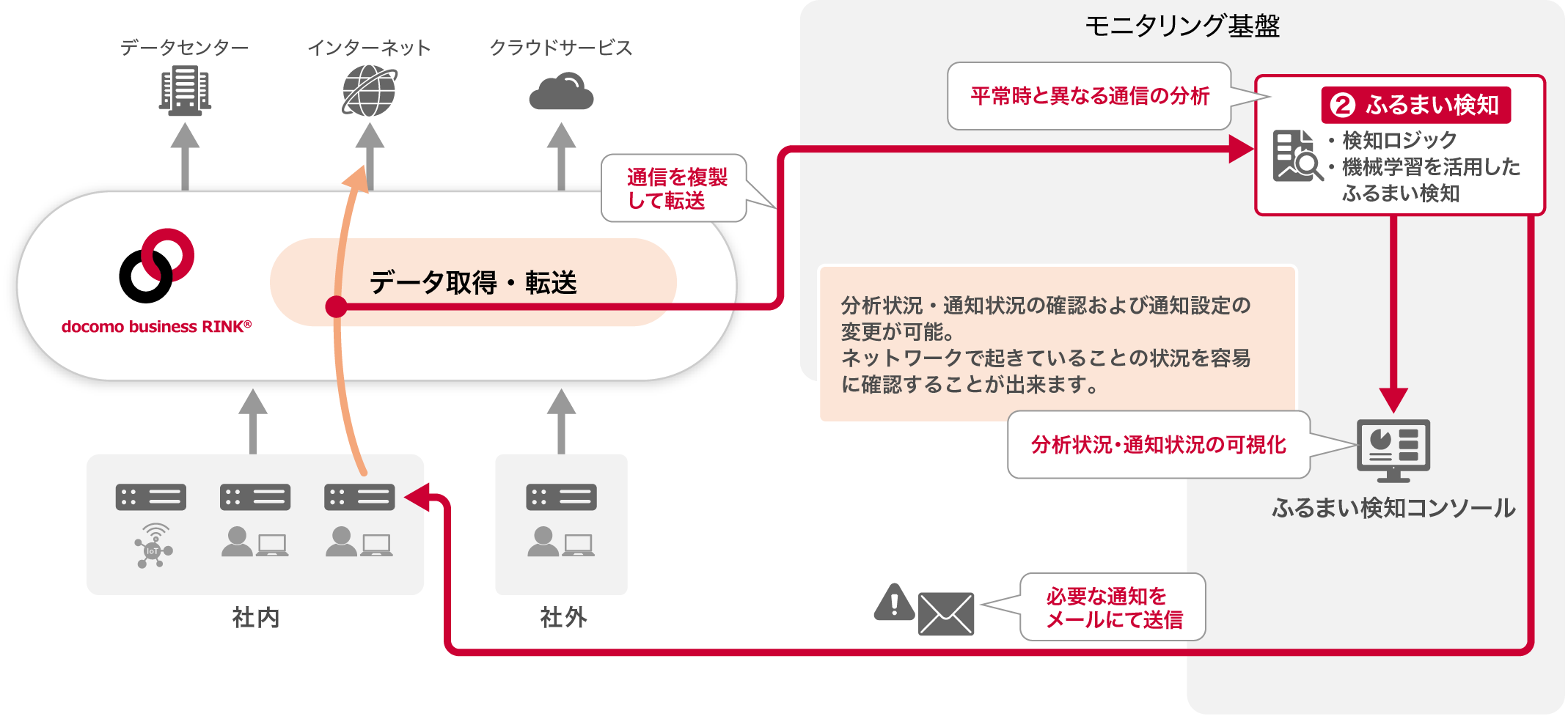 - 検知ロジック・機械学習に基づき通信データを分析
