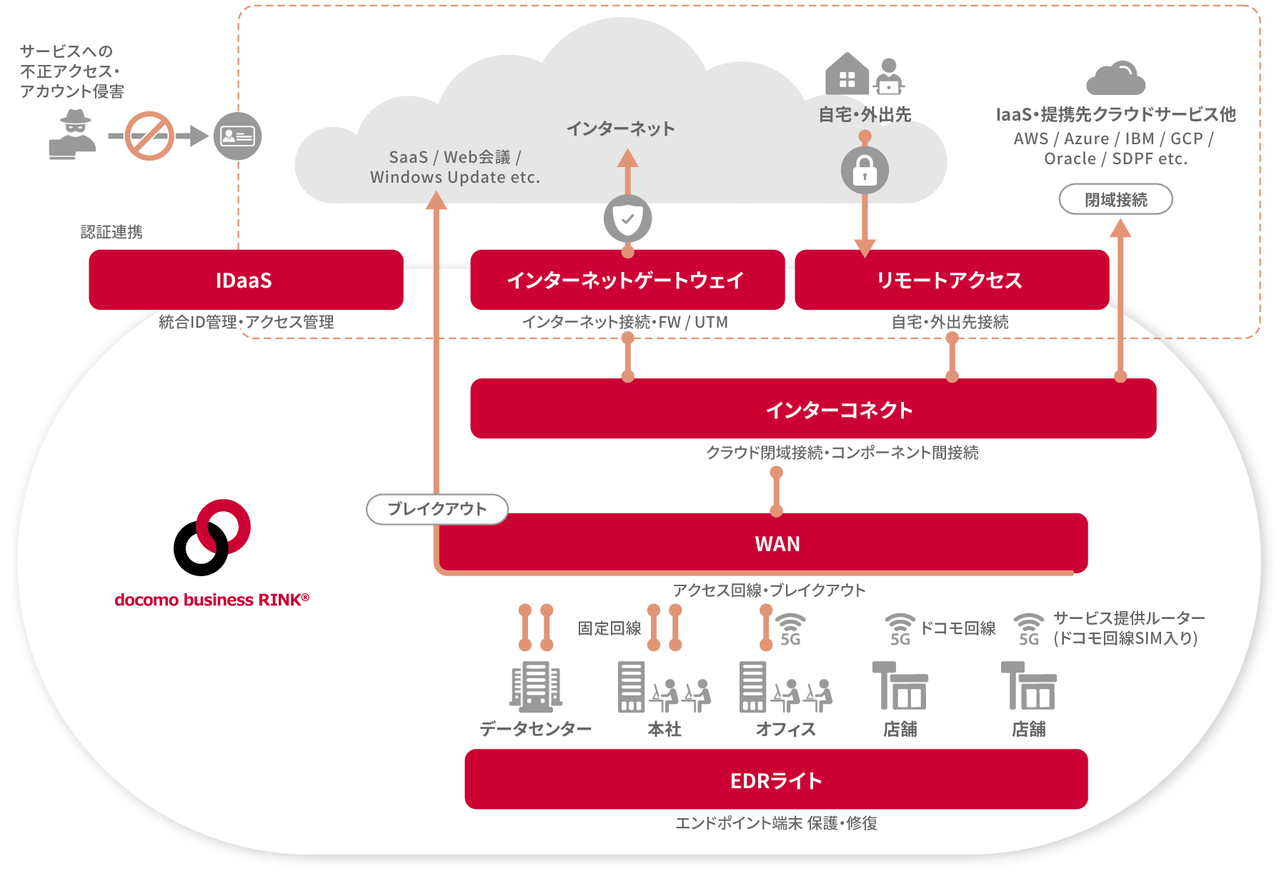 docomo business RINK®では安全・快適なクラウドサービス活用を実現する5つのコンポーネントからなる統合サービスです。