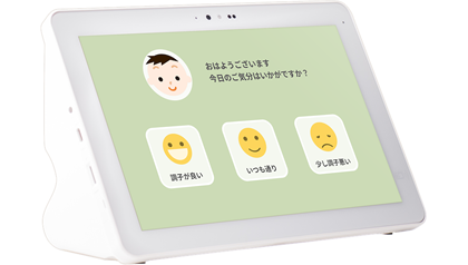 ✔ 毎朝hoam®端末を介して利用者は体調アンケートに回答し、見守り関係者は自動連携される結果を確認している。