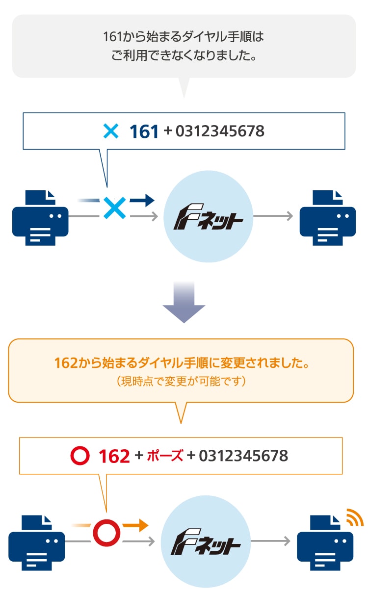 | BizFAXサービスの対処 | お客さまにて162から始まるダイヤル手順に変更願います。 |