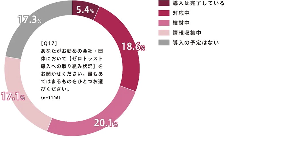 ネットアテストの「ゼロトラスト導入への取り組み状況」についての調査によると、ゼロトラストの導入について、「検討中」(20.1%)、「対応中」(18.6%)、「導入は完了している」(5.4%)となっていて、全体の約5割の企業・団体が、ゼロトラストセキュリティの導入に前向きである結果が出ています。いま、多くの企業が境界防御モデルからゼロトラストへの移行を進めているのです。