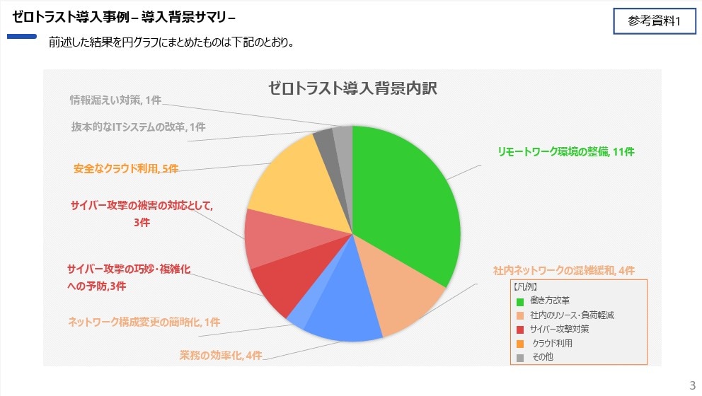 2023年11月にデジタル庁が開催した「国・地方ネットワークの将来像及び実現シナリオに関する検討会(第2回)」にて配布された資料では、インターネットにてゼロトラスト導入事例が公開されている民間企業の導入事例(23事例)に対する調査結果が公開されており、ゼロトラスト導入に至った導入背景の内訳のトップは、「リモートワーク環境の整備」(11件)となっています。