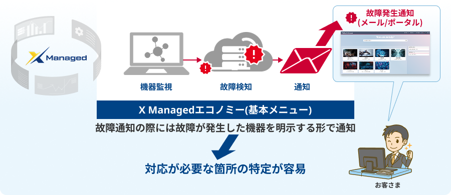 X Managedエコノミーの運用では、「機器監視」「故障検知」「通知」を基本メニューにて実現します。