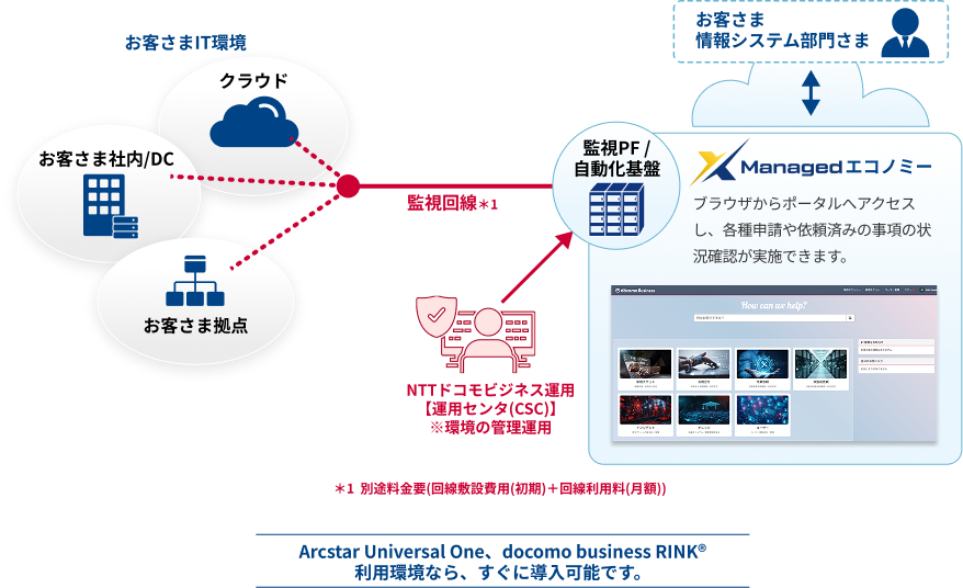 - 監視対象環境とサービス間は 閉域接続が前提で、接続回線の契約が別途必要です(対応回線種別:Arcstar Universal One、docomo business RINKなど)