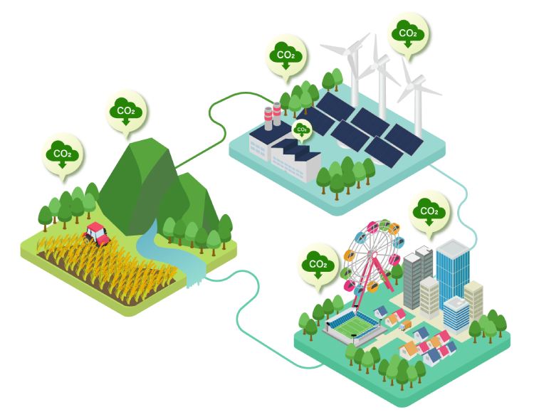GXを通じて、企業のカーボンニュートラル達成を支援し、GX-ETSや、Jークレジットを活用したソリューションを提供します。