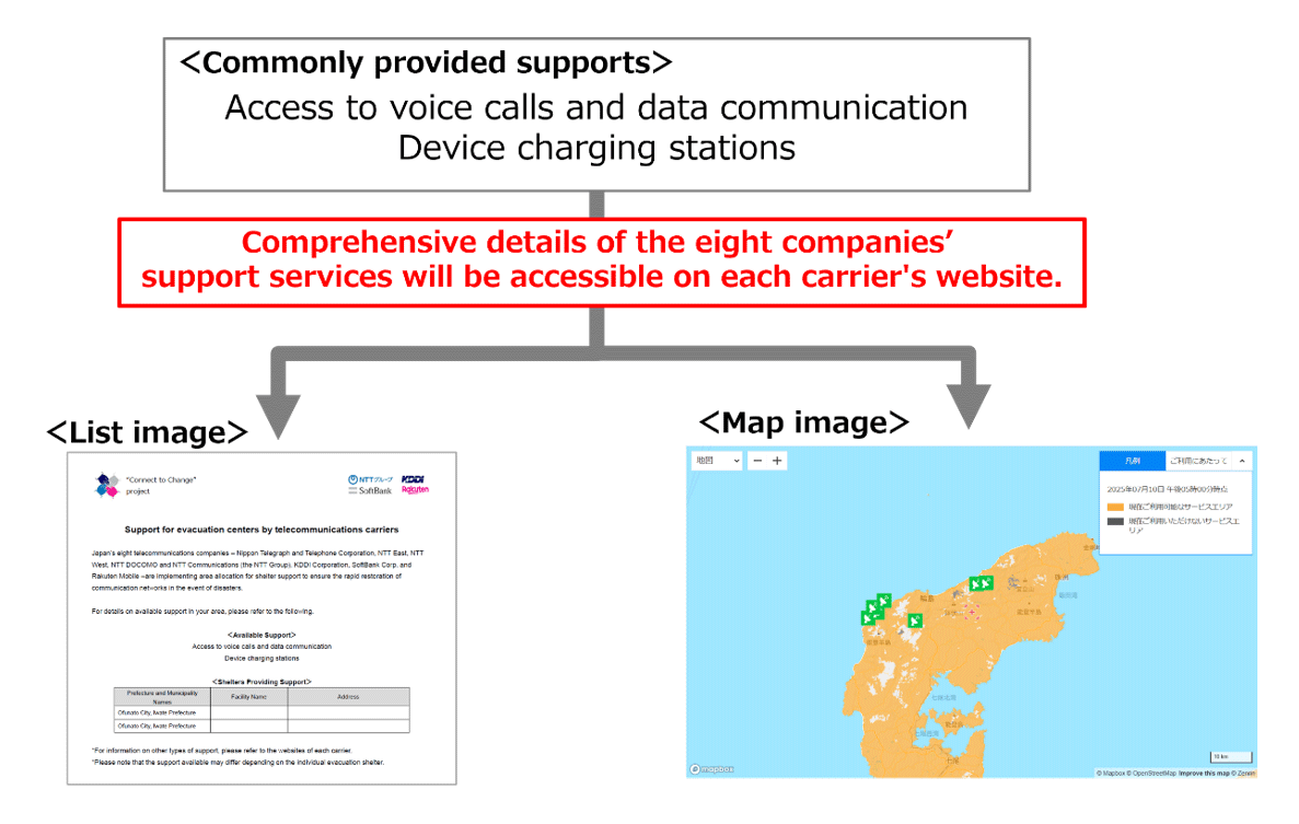 Tokyo, October 22, 2025 – Japan’s eight telecommunications companies – NTT, Inc., NTT EAST, NTT WEST, NTT DOCOMO and NTT DOCOMO BUSINESS (the NTT Group), KDDI Corporation, SoftBank Corp. and Rakuten Mobile – today announced the implementation of area allocation for evacuation shelter support and the standardization of an information dissemination system starting October 22, 2025. These measures, complementing the cooperative information-sharing system launched in early July 2025*1, are being implemented by the companies with the aim of further expediting support for disaster-affected areas during large-scale disasters.