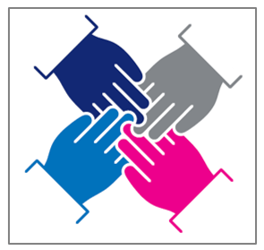 The logo incorporates the corporate colors of NTT, KDDI, SoftBank and Rakuten Mobile within its four-hand design. These hands, overlapping and converging at the center, symbolize the unified effort of the four companies working toward a shared objective.
