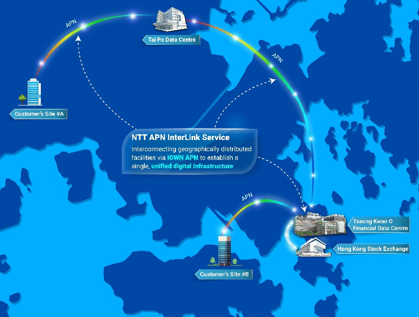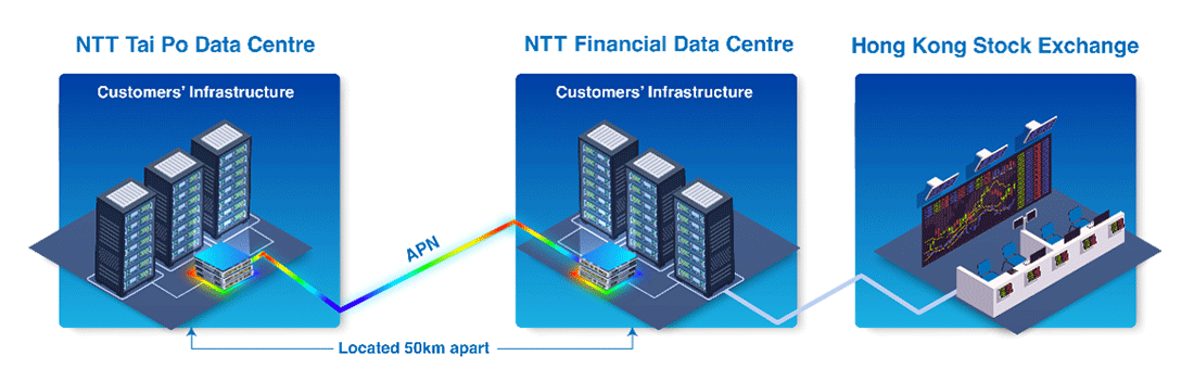 1.APN Connection between Data Centers (APN DCLink):The interconnection between NTT Com Asia’s Financial Data Center and Tai Po Data Center via APN delivers an ultra-low latency network. With the Financial Data Center is located in close proximity to the Hong Kong Stock Exchange (HKEX), the interconnection ensures optimal performance for mission-critical financial operations such as latency-sensitive trading and real-time transaction processing.