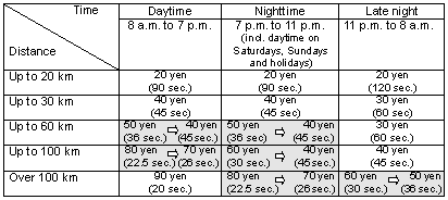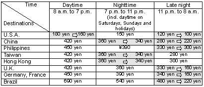 Note 3: Maximum reduction rate: 33% for late-night calls covering distances from 60 km to 100 km. Average reduction (of rates shown in shaded areas): 19%.
