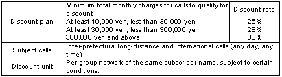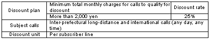 The NTT Communications Home Discount service plan provides a 25% discount on call charges when the total monthly charges for inter-prefectural long-distance calls and international calls amounts to ¥2,000 or more. There is no fixed charge or registration fee to obtain this discount.
