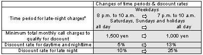 The time period for which discounted late-night charges apply will be expanded. Also, the discount rate will be given to users with monthly charges of 1,000 yen or more, instead of 1,500 yen or more, and the discount rate will be increased.
