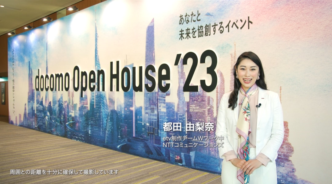 担当していた仕事が相次いでクロージングを迎えた入社3年目のタイミングで、都田さんは学生時代に経験したイベントMCの世界に舞い戻った。兼業申請の上で、数万人が来場する台東区主催のイベントや、大手企業スポンサーのミスコンテストの司会を担当したこともある。また、NTTドコモの展示会「docomo Open House」の司会や、NTTドコモの社内動画「eTV」の初代レポーター、新規事業創出プログラム「docomo STARTUP」の最終ピッチ大会のMCなど、社内の仕事も多く任されてきた。社内で「司会の都田さんですよね」と声を掛けられることもある。